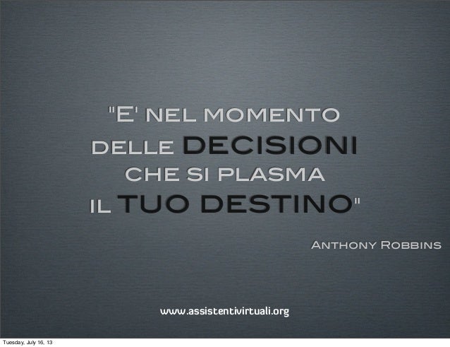 People who succeed focus on what it will feel like at the end“ Help us translate this quote. Frasi Motivazionali 1 frasi di motivazione wwwassistentivirtualiorg Tuesday, July 16, 13 2 "E' nel momento delle decisioni che si plasma il tuo destino" Anthony Robbins wwwassistentivirtualiorg Tuesday, July 16, 13. Anthony Robbins is an extremely successful life coach As well as being an entrepreneur, author and public speaker He has written many amazing books including ‘Waking the Giant within’ And ‘Unlimited Power’ Quotes you’re about to read are from these books!.