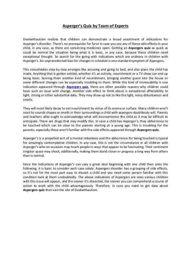 This is an interactive online Asperger’s test for AdultsThe questions will vary in complexity based on your age and gender Once your complete the test, you will receive a comprehensive analysis (displayed both on screen, and also to you sent by email) with a full report of your Asperger’s quotient and areas where you show strong Aspie symptoms. Doctors used to think of Asperger's as a separate condition But in 13, the newest edition of the standard book that mental health experts use, called The Diagnostic and Statistical Manual of. Your Aspie score 127 of 0 Your neurotypical (nonautistic) score of 0 You are very likely an Aspie I did have to wonder a bit about the "biting other people when ask to" question Take the Aspie Quiz.