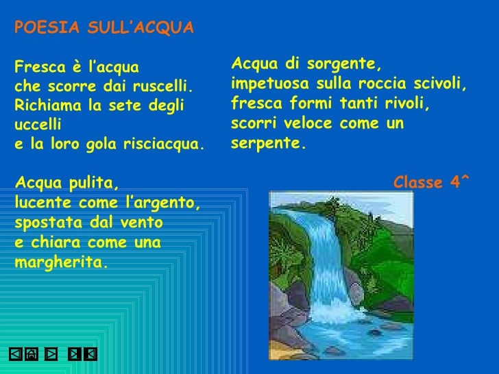 L'ACQUA PER LA VITA Home Potabile o no?. Aforismi e frasi sull'acqua raccolta di citazioni sull'acqua e sulla sua importanza per il nostro pianeta e per le nostre vite Credo che l’acqua sia l’unica bevanda per un uomo saggio Henry David Thoreau Fai una escursione nell'acqua e nell'aria buona;. Poesie e filastrocche ACQUA – una raccolta di poesie e filastrocche sull’acqua, di autori vari, per bambini della scuola d’infanzia e primaria La goccia (G Noseda) Io sono la piccola garrula goccia che sgorga timida fuor dalla roccia sono la gocciola fresca e lucente che scende querula lungo il torrente sono la tremula splendente stilla.