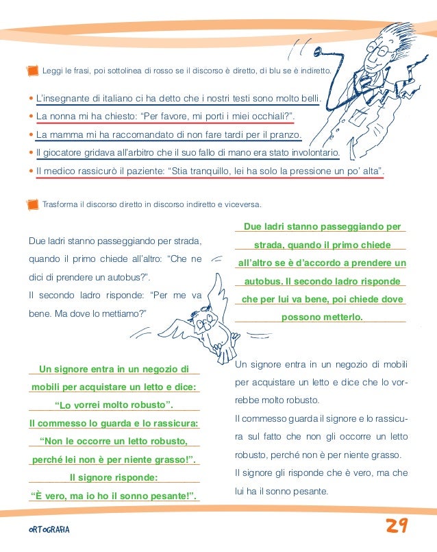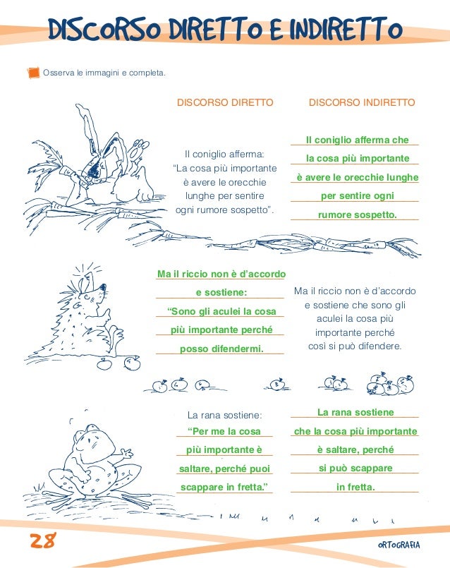 Classe terza frasi discorso diretto e indiretto scuola primaria. N21 ** Nei seguenti periodi aggiungi i segni di punteggiatura che segnalano la presenza del discorso diretto (14 e 10 coppie di virgolette) e inserisci le maiuscole dove occorrono (sono 7) 1 Cesare gli chiese quale sport preferisci il tennis rispose Luca 2 Il medico mi domandò ti fa male la gola io risposi no 3 Sono io, apri la. Discorso diretto e discorso indiretto in quarta nel mese di giugno Dal discorso diretto al discorso indiretto usando le tre paroline legame “se, di, che” E’ un esercizio non semplice per i bimbi Consiglio di eseguire con un’attività guidata e collettiva Dal discorso indiretto al discorso diretto con un testo che parla di vacanze. Marzo 18 Ho svolto in parallelo il lavoro sul discorso diretto e indiretto partendo dai fumetti Per la presentazione del lavoro abbiamo ingrandito il quaderno aggiungendo un’aletta Così facendo abbiamo riservato una pagina per ogni argomento Ai bambini è piaciuto molto Mi hanno detto che sono ingegnosa!.