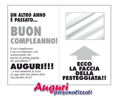 Biglietto giornale "Il mezzo secolo d'italia" Compleanno lui 50 anni Biglietto giornale di cm32x49,con applicata all'interno una carta a specchioIn questo insolito e divertente biglietto d'auguri dall'impaginazione e dalle misure del tutto uguali ad un quotidiano, la notizia del giorno è il compleanno del vostro amicoTanti servizi simpatici e divertenti sul festeggiato e la festa per i. Auguri di buon compleanno divertenti per un'amica Quante risate ti sei fatta con l'amica del cuore ?. Biglietti auguri compleanno Proprio perciò il nostro sito mette a disposizione differenti frasi di auguri di compleanno ce ne sono simpatiche o divertenti, intime o familiari e anche formali, da usare a seconda della persona.