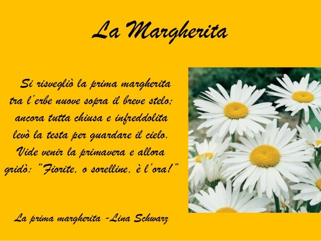 Margherita e Giuseppe sono molto felici insieme, almeno per ora Margherita, chiama tua madre!. Buongiorno margherite Aggiunta il 11 Aprile 19 da buongiorno Immagini simili Buonanotte gratis Buon Mercoledì immagini buon sabato Buon Sabato immagini buon venerdì Buon Venerdì immagini citazioni cuore di anna frasi Frasi Citazioni e Aforismi da condividere giorno dopo giorno immagini buonanotte immagini buongiorno Immagini di. Margherita Dolcevita, frasi Stefano Benni Creato il 14 giugno 13 da Frufru @frufru_90 Dentro un raggio di sole che entra dalla finestra, talvolta vediamo la vita nell'aria E la chiamiamo polvere Il modo si divide in quelli che mangiano il cioccolato senza pane;.